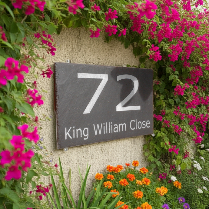 ~ Sealed and ready for long term outdoor use (Signs will last many years). ~ Including Fixings (Screws/Plugs/Caps). ~ Pre Drilled Holes (Holes in each side as standard or request hole location or no holes). ~ Choose any font (Times New Roman is most popular and our standard font). ~ Surface Engraved created with our state of the art laser engravers. ~ Laser engraved lettering will vary from light grey to mid-grey as in listing main photo. ~ White/Gold/Silver Lettering airbrushed with permanent acrylic, painted on to the surface of the sign (not engraved), is available for £7.50 extra on request. ~ Beautiful Natural Slate House Sign, Dark Natural Slate Expertly cut by Master Craftsmen. ~ We use Royal Mail & Parcel Force. ~ 1st 4 Signs: A Long Standing Kent Based Sign Manufacturer ~ Free Delivery ~ Money Back Guarantee ~ Free Designs On Request ~ Friendly Advisors ~ Trusted Online Reviews & Testimonials.
