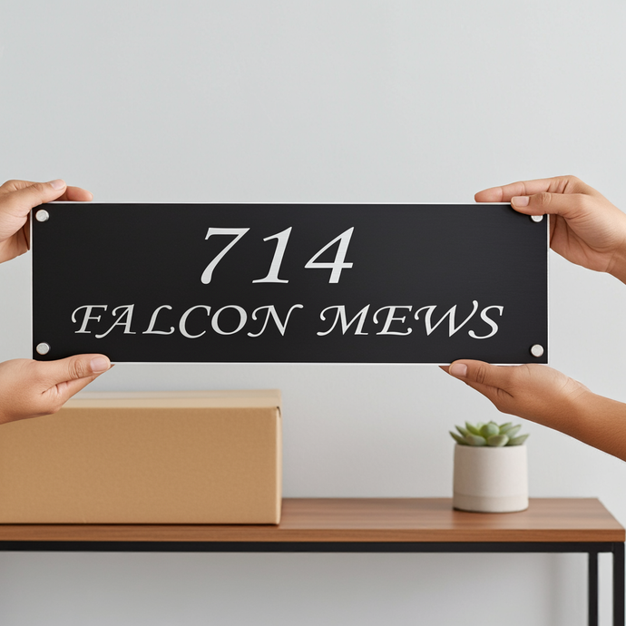House number sign on a building exterior with '714 Falcon Mews' text.